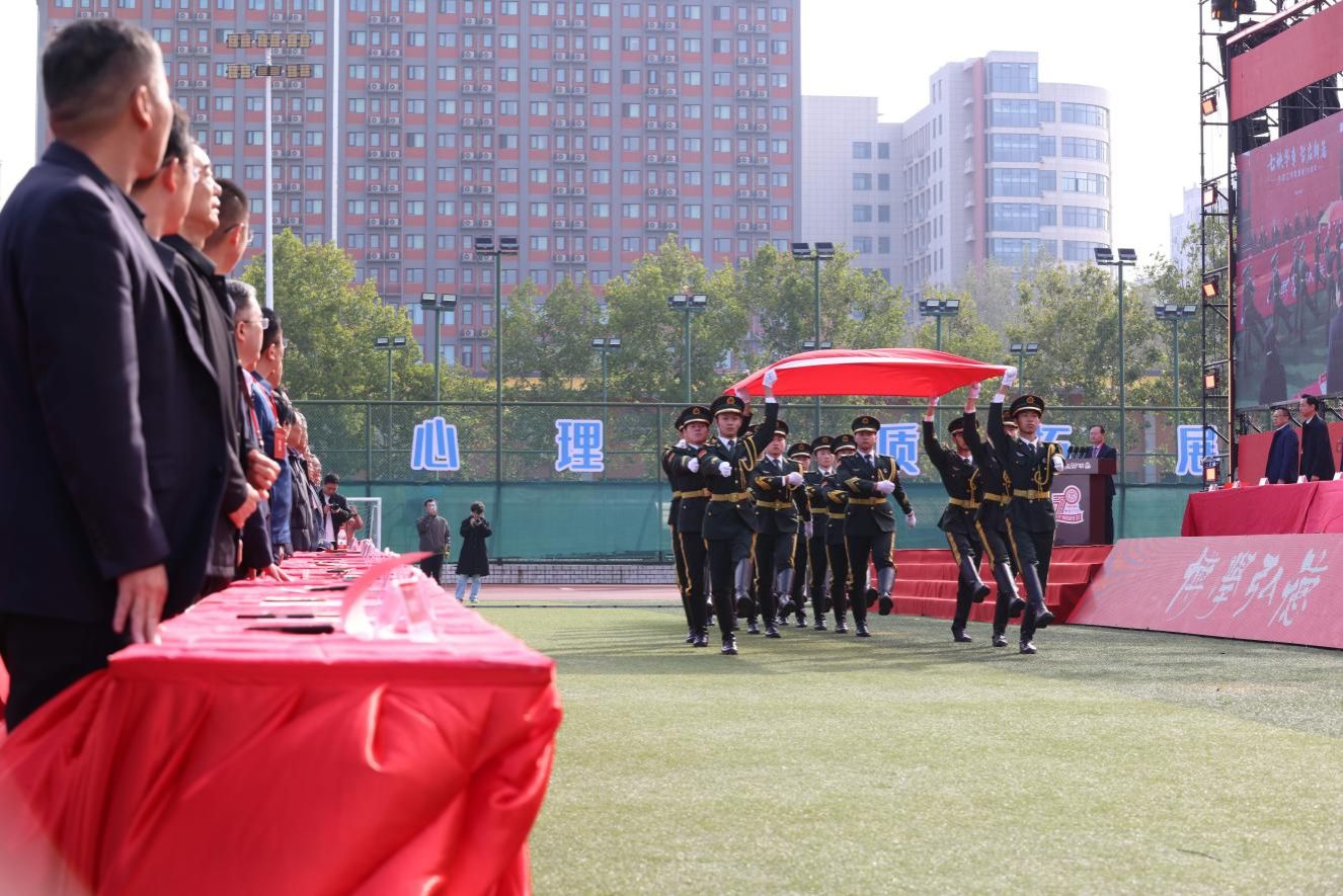 上午9时,全场肃立,迎国旗、奏国歌,庆典大会正式开启。