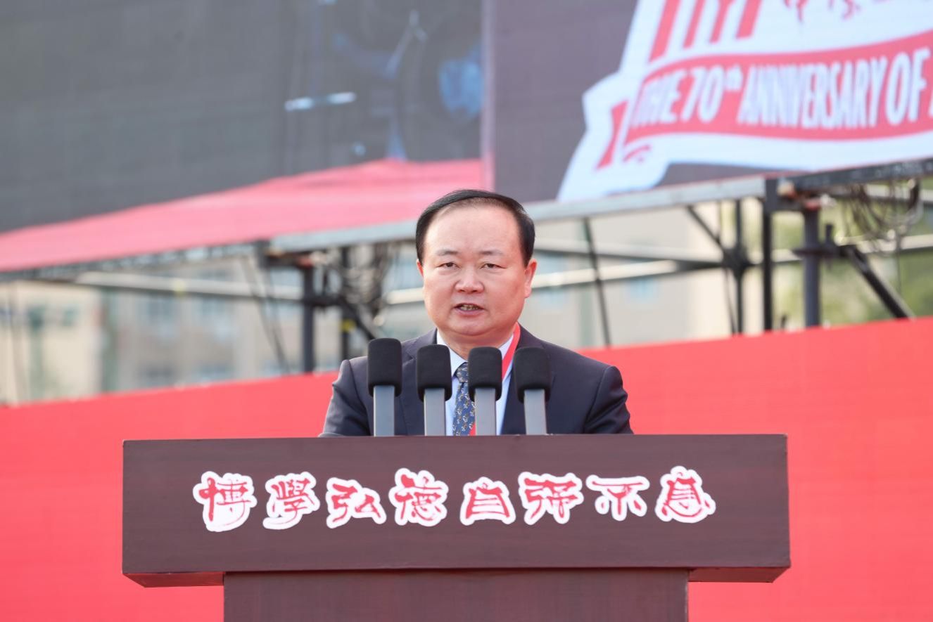 陈革代表东华大学以兄弟院校代表和校友的双重身份向中原工学院70周年校庆致以热烈祝贺。他深情回顾了两校的血脉渊源和长期紧密的合作情谊,并表示东华大学愿与中原工学院在巩固传统纺织领域合作基础上,共同开拓电子信息、新材料、智能制造等新兴交叉领域,协力攻克关键核心技术,为培养时代新人和服务国家战略贡献智慧与力量。