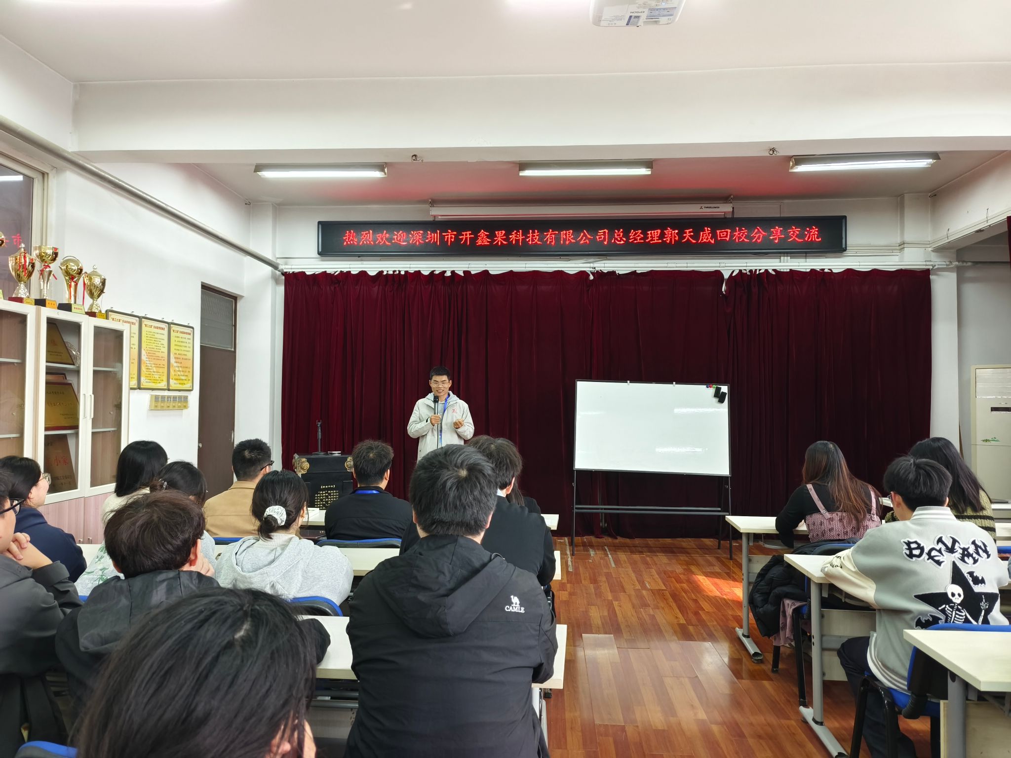下午2时,校友大讲堂活动在龙湖校区举行,特邀深圳市开鑫果科技有限公司总经理、深圳校友会材电分会会长、材科13级校友郭天威担任主讲人,学院80余名学生参加讲座。讲座由学院党委副书记熊瑛主持。