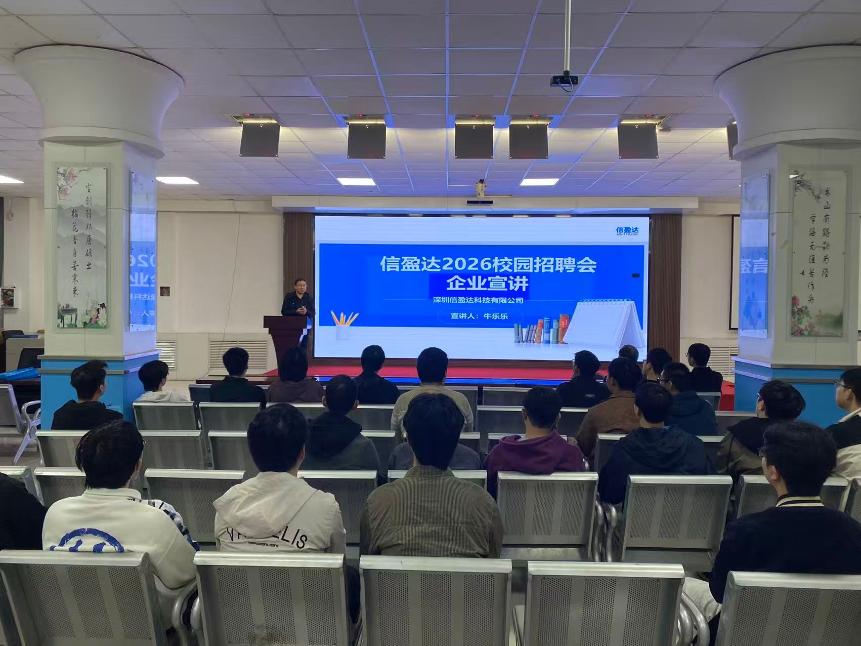 10月17日,由就业指导中心主办、信息与通信工程学院和自动化与电气工程学院承办的深圳信盈达电子有限公司专场招聘会在龙湖校区举行,公司创办人、2004届校友牛乐乐介绍公司发展情况,50余名毕业生参加。